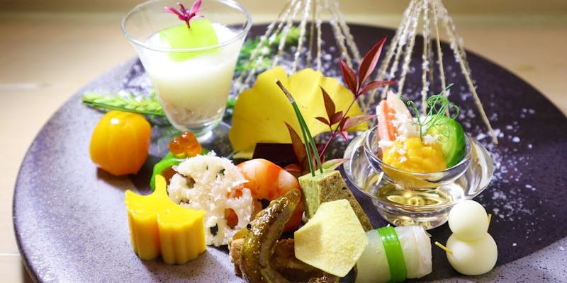 「くずし割烹 天ぷら竹の庵 東銀座店」には豊富なコース料理が揃っていますが、接待の際におすすめするのは「織部コース」で、先付、八寸、御椀、御造り、一の皿、二の皿、天ぷら、食事、止、甘味の全12品をゆっくりと2時間半の時間をかけれ味わうコースです。