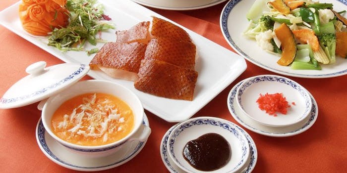香ばしく揚げられた「北京ダック」や人気の「エビのチリソース煮」、さらに「かにの卵入りふかひれスープ」など、単品メニューも充実。「特選フルコース」は、お店自慢の中華料理をおもいっきり楽しめるフルコース。さらに2時間飲み放題のコースもあります。